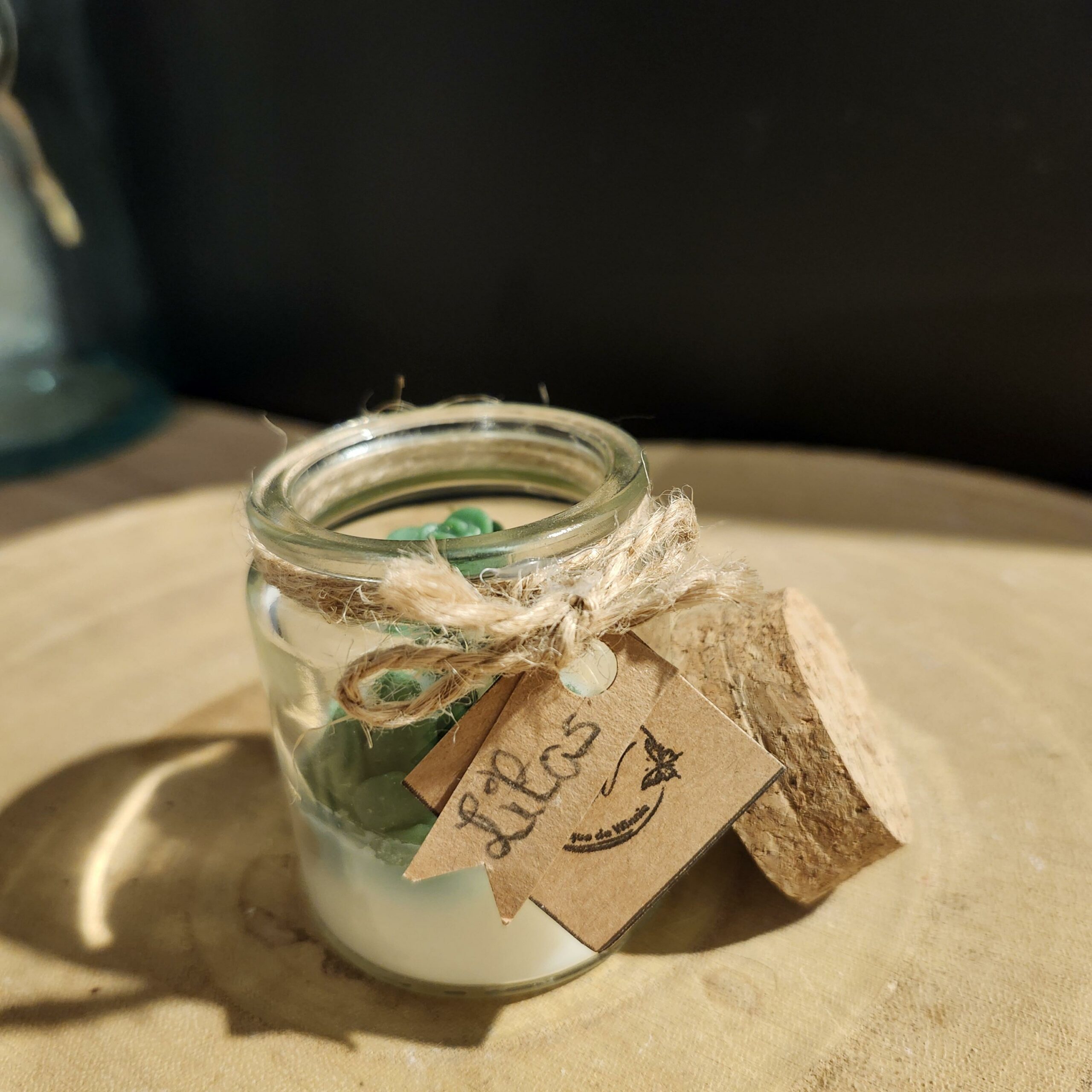 Bougie en cire de colza coulée dans un petit pot en verre avec couvercle en liège.