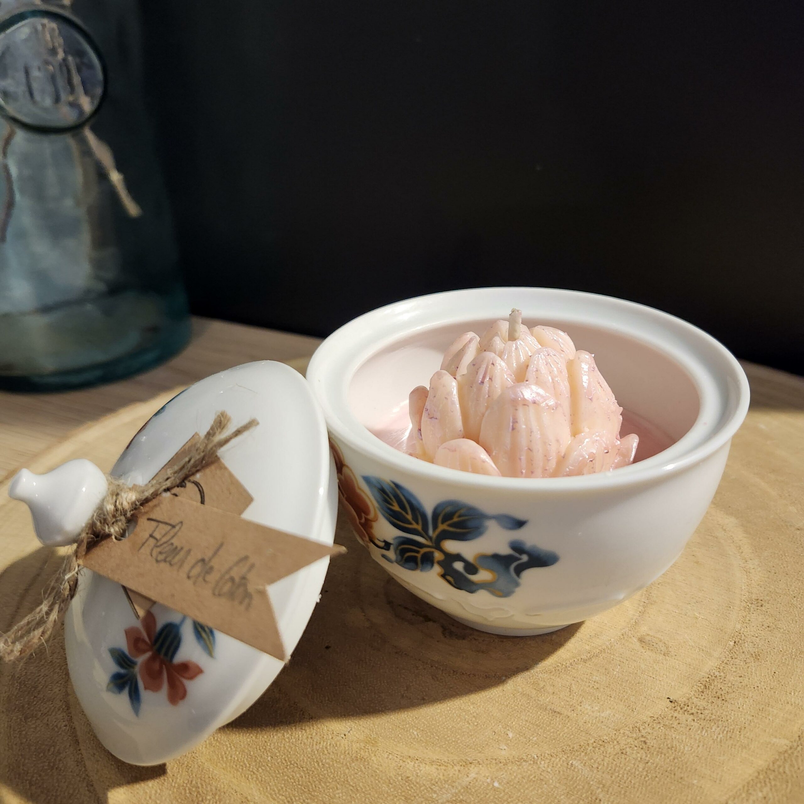 Bougie en cire de colza coulée dans un ancien sucrier avec une joile fleur de Lotus.