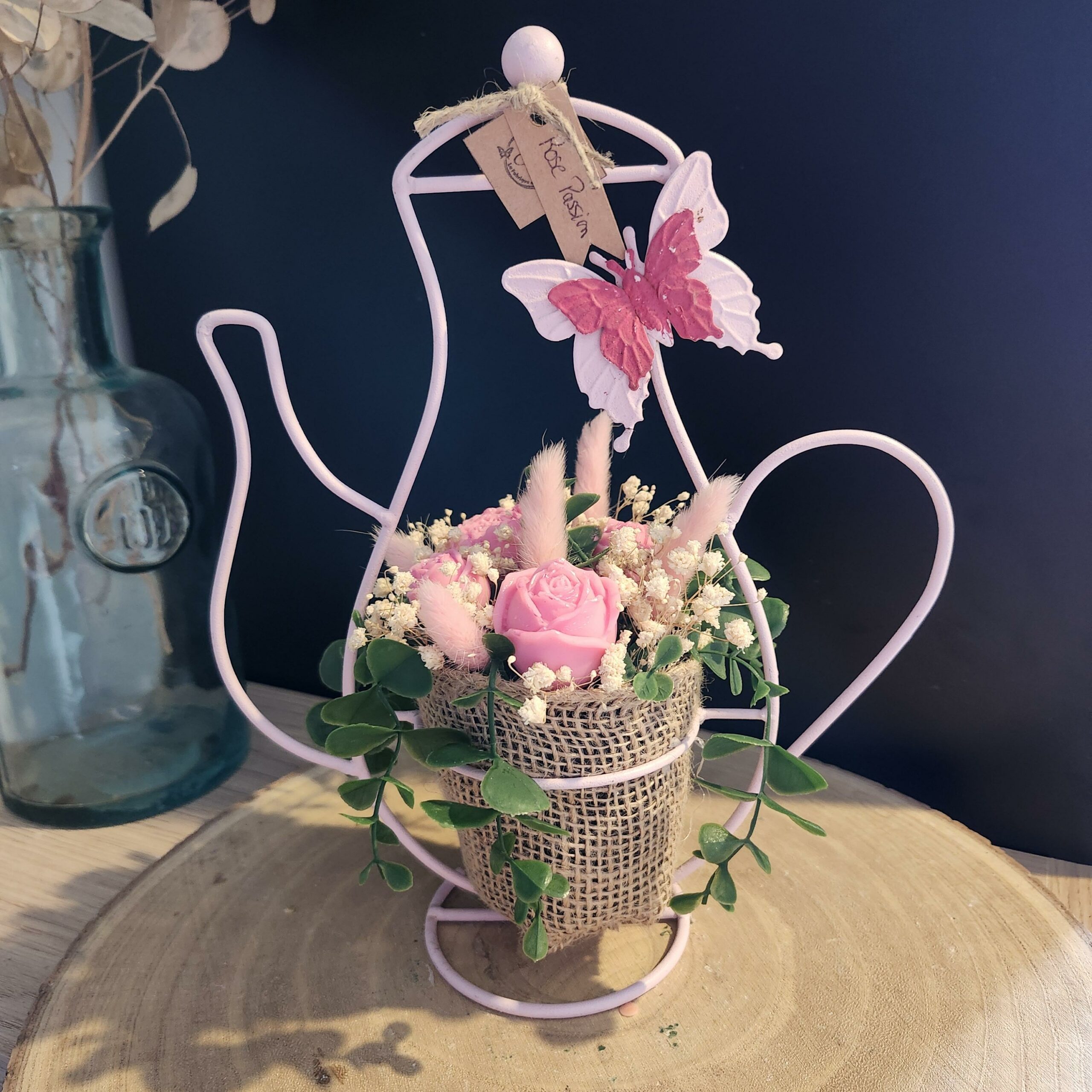 Bouquet Eternel dans une décoration métal forme de cafetière.